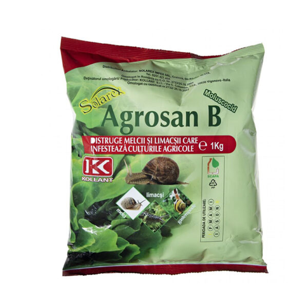Agrosan B este un moluscocid sub forma de granule albe, avand in compozitie 5% metaldehida, o substanta activa eficienta in combaterea melcilor si limacsilor care afecteaza culturile agricole. Granulele au dimensiuni intre 5-7 mm si un diametru de 1 mm, ceea ce le face usor de manevrat si aplicat.Datorita compozitiei sale chimice, Agrosan B atrage molustele cu ajutorul proteinelor din momeala. Un alt avantaj este ca produsul nu mucegaieste, nu este spalat de ploaie si nu este indepartat de vant, fiind astfel foarte rezistent in conditii de teren.Instructiuni de utilizare:Agrosan B actioneaza eficient asupra melcilor si limacsilor prin contact si ingerare, distrugand celulele de mucus ale acestora si provocandu-le moartea. Momeala se aplica fie prin imprastiere pe sol, fie in randuri. Pentru a preveni infestarile din exterior, se recomanda aplicarea produsului de-a lungul marginilor suprafetelor tratate.Doze recomandate:Legume de camp: Pentru combaterea melcilor fara cochilie (Agriolimax agreste), doza recomandata este de 15 kg/ha, fara a necesita incorporare.Se aplica de preferat seara, dupa ploaie sau irigare, cand activitatea molustelor este crescuta.Mod de ambalare:Agrosan B este disponibil in pachete de 15g, 50g, 150g si 500g, fiind usor de utilizat pe suprafete mari sau mici.Granulele raman eficiente si sunt rezistente la intemperii.