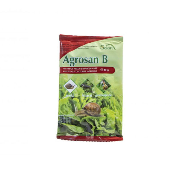 Agrosan B este un moluscocid sub forma de granule albe, avand in compozitie 5% metaldehida, o substanta activa eficienta in combaterea melcilor si limacsilor care afecteaza culturile agricole. Granulele au dimensiuni intre 5-7 mm si un diametru de 1 mm, ceea ce le face usor de manevrat si aplicat.Datorita compozitiei sale chimice, Agrosan B atrage molustele cu ajutorul proteinelor din momeala. Un alt avantaj este ca produsul nu mucegaieste, nu este spalat de ploaie si nu este indepartat de vant, fiind astfel foarte rezistent in conditii de teren.Instructiuni de utilizare:Agrosan B actioneaza eficient asupra melcilor si limacsilor prin contact si ingerare, distrugand celulele de mucus ale acestora si provocandu-le moartea. Momeala se aplica fie prin imprastiere pe sol, fie in randuri. Pentru a preveni infestarile din exterior, se recomanda aplicarea produsului de-a lungul marginilor suprafetelor tratate.Doze recomandate:Legume de camp: Pentru combaterea melcilor fara cochilie (Agriolimax agreste), doza recomandata este de 15 kg/ha, fara a necesita incorporare.Se aplica de preferat seara, dupa ploaie sau irigare, cand activitatea molustelor este crescuta.Mod de ambalare:Agrosan B este disponibil in pachete de 15g, 50g, 150g si 500g, fiind usor de utilizat pe suprafete mari sau mici.Granulele raman eficiente si sunt rezistente la intemperii.