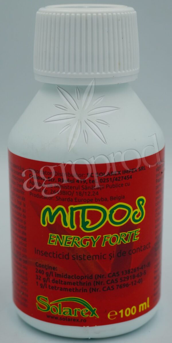 Midos Energy Forte este un biocid insecticid formulat sub formă de suspensie concentrată, de culoare albă, fără miros, neinflamabil, neexploziv și neoxidant. Produsul este destinat combaterii eficiente a insectelor târâtoare și zburătoare, fiind conceput pentru aplicare prin pulverizare în mediile infestate.