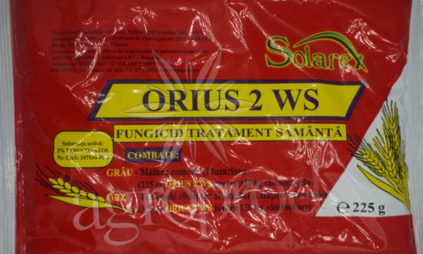 Fungicid tratament samanta Contine : 20 g/l tebuconazol Mod de actiune: Orius 2 WS are actiune sistemica impotriva agentilor patogeni localizati pe samanta de cereale sau in interiorul acesteia. Instructiuni de utilizare: Grau – Malura comuna; Fuzarioza – 1,5 kg/tona Orz – Taciunele zburator; Sfasierea frunzelor – 1,5 kg/tona Fiind conditionat ca pulbere dispersabila , Orius 2 WS se utilizeaza in mediu umed. Se introduce volumul necesar de apa intr-un vas, se adauga cantitatea corespunzatoare de produs si se lasa sa disperseze complet in apa, dupa care suspensia rezultata se utilizeaza la tratament. Raportul intre cantitatea de produs si volumul de apa este cuprins intre 1:5 si 1:6 (kg produs/L apa), In acest caz , volumul de apa este dependent de caracteristicile tehnice ale masinii de tratat si de calitatea semintelor ce se trateaza, avand insa grija sa nu se adauge prea multa apa pentru a nu declansa prematur incoltirea. Este important ca in procesul de tratare sa se realizeze o dozare corecta a produsului si o distributie cat mai uniforma a sa pe toate semintele.