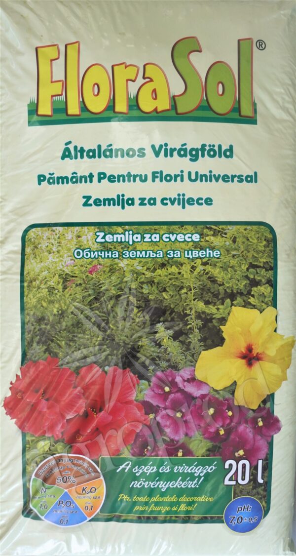 Produsele Florasol au fost concepute pentru a satisface un mai mare grup de cumparatori, deoarece datorita ambalajului mai simplu sunt mai ieftine dar de calitate. Pamant pentru flori universal Florasol (pH 6,0-7,5), substrat cu structura usoara, de culoare maro, lipsit de mirosuri neplacute. Pamantul de flori Florasol are un nivel de nutritie ce este potrivit in general pentru toate tipurile de plante. Pamant de flori Florasol se foloseste ca substrat la toate tipurile de plante interioare si exterioare, plante de balcon, la arbori, arbusti, trandafiri, etc. Continut: turba eutrofa, turba oligotrofa, imbogatit cu ingrasaminte complexe. Continut de N min. 300 mg/l, P2O5 min. 100 mg/l, K2O min. 30,g/l