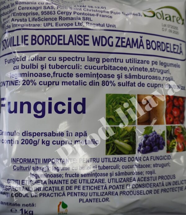 Zeama bordeleza (Bouille Bordelaise® WDG) este un fungicid de contact, pe baza de cupru, care controleaza mai multe boli cauzate de ciuperci si bacterii: alternarioza, rapan, foc bacterian, ciuruire, patare unghiulara etc. Omologari fungicid contact Zeama bordeleza (Bouillie Bordelaise) Castraveti Boli combatute: Mana curcubitaceelor, patarea unghiulara Doza: 0.75% (7.5 kg/ha) Ceapa Boli combatute: Mana cepei Doza: 0.75% (7.5 kg/ha) Cires si visin Boli combatute: Patarea frunzelor, ciuruirea frunzelor, monilioza fructelor Doza: 0.5% (5.0 kg/ha) Fasole de gradina Boli combatute: Arsura aureolata, arsura bacteriana Doza: 0.75% (7.5 kg/ha) Gutui Boli combatute: Focul bacterian al rosaceelor Doza: 7.5 kg/ha Mar Boli combatute: Focul bacterian al rosaceelor, rapanul marului Doza: 0.5% (7.5 kg/ha) Par Boli combatute: Focul bacterian al rosaceelor Doza: 7.5 kg/ha Boli combatute: Rapanul parului Doza: 0.5% (5,0 kg/ha) Piersic Boli combatute: Basicarea frunzelor, ciuruirea frunzelor, monilioza fructelor Doza: 0.5% (5.0 kg/ha) Prun Boli combatute: Patarea rosie a frunzelor de prun, ciuruirea frunzelor, monilioza fructelor Doza: 0.5% (5.0 kg/ha) Tomate Boli combatute: Mana tomatelor, patarea bruna a frunzelor, patarea frunzelor si basicarea fructelor Doza: 0.75% (7.5 kg/ha) Vita de vie Boli combatute: Mana vitei de vie Doza: 0.5% postfloral (5.0 kg/ha)